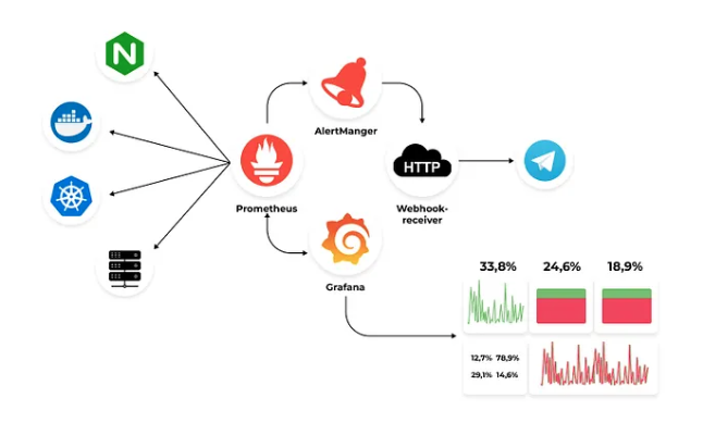 Pull-based model to scrape metrics from exporters (e.g., node, application, Kubernetes).